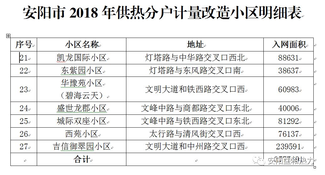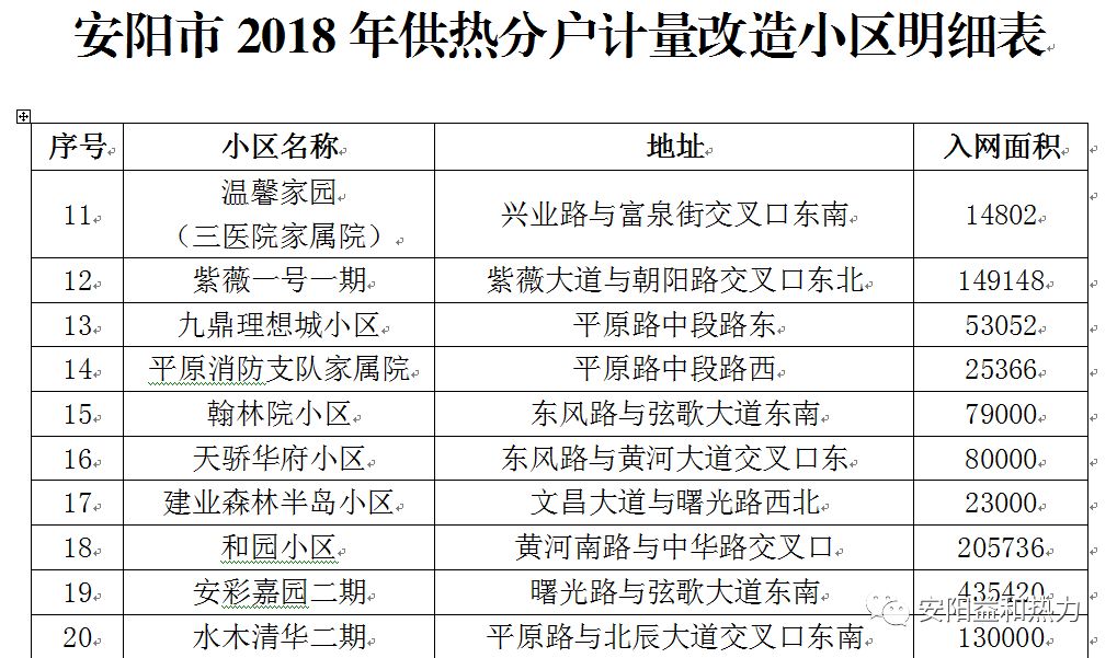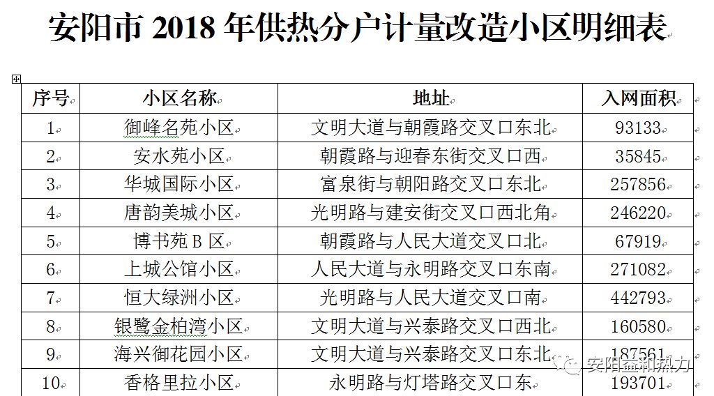 2018年,我市對(duì)建成區(qū)及周邊50余個(gè)集中供熱小區(qū)進(jìn)行了供熱計(jì)量宣傳普及工作,結(jié)合政策要求、居民意愿等,確定了御峰名苑、上城公館等27個(gè)小區(qū)為2018年供熱分戶(hù)計(jì)量改造小區(qū),涉及用熱面積370余萬(wàn)平方米。詳見(jiàn)下表: